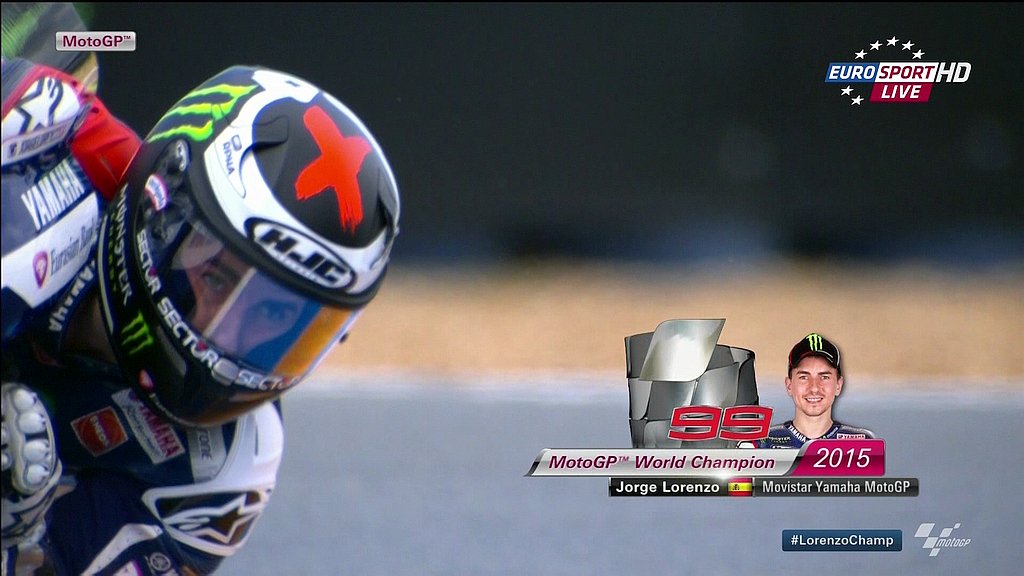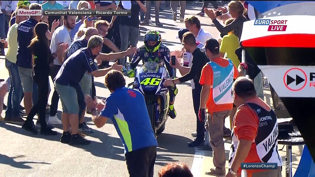 A imagem desta prova não é o Lorenzo campeão, mas sim, esta abaixo: Rossi sendo ovacionado por todas as equipes voltando aos boxes. Sendo esperado por centenas de pessoas no Box.